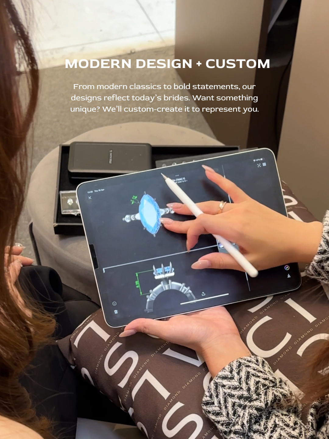 Discover diamond shapes, settings, and modern designs made for today’s couples. With expert guidance and 40 years of craftsmanship, we’ll help you create a ring that’s timeless, personal, and truly yours.